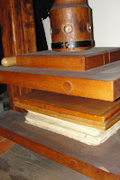 After the ink was applied and the cloth paper (they didn’t make paper out of trees in the 1700s) laid out on the opposing wooden lid, the lid was lowered and secured in place on top of the printing plate, and the entire thing was rolled under the press which was then cranked down onto the printing plate to “stamp” the paper with the inked print.
