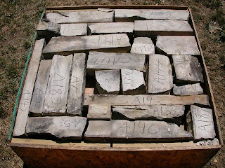 The house must be rebuilt with each stone in the same position, so each stone is numbered. Note the tags on each stone. The stones are identified by an alpha designating the location of the wall and a numeric designating the location of the wall and a numeric indicating its position. Every stone in the house is numbered.