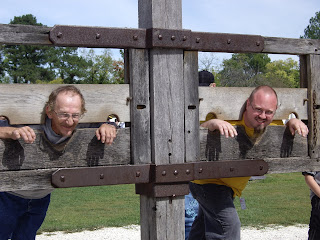 Danielle and Jonathan spent three days in Colonial Williamsburg with Jonathan’s parents Donald and Diane. The picture shows Jonathan and his dad in the stocks next to the courthouse – they quickly learned that public punishment was not very comfortable. A lot has changed in Williamsburg since Danielle and Jonathan visited Thanksgiving 2001. They are in the process of building a new plantation close to the Colonial Capital of Virginia to show how the majority of people lived during this time period – they have a few buildings built (the smaller outbuildings) and they will have to wait until the coffeehouse next to the Capital building is finished being built (next fall) for the carpenters (using only 18th century tools) to build the main house at the plantation.